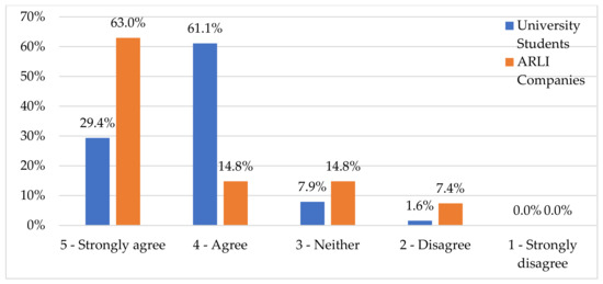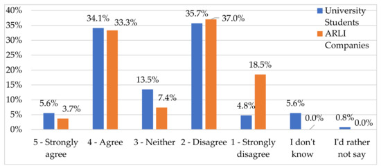 Liakos et al. [36] asked their respondents to rank how much they agreed that a CE is essentially the 3Rs (Q1.2), with around two-thirds disagreeing with the statement. Only a third of respondents were aware of what the 3Rs stood for and agreed that they adequately represent CE [34]. This current research validates both of these findings—with 39.7% of students and 37.0% of company respondents’ agreeing respectively to CE being just another buzzword for the 3Rs concept. This might be caused by the 3Rs being the critical association between the environmental and financial aspects on the more technical side of a CE [36].
