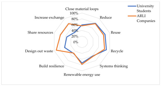 Figure 3 presents the results from Q1.3, the main categories of CE research and practice selected from different studies [17,18,30,31]. The first observation is that the 3Rs are embedded in the interpretations of both groups of respondents. The “Design out waste”, “Share resources” and “Increase exchange” responses were selected more frequently by the industry respondents. The least identified category was “Build resilience” with a selection rate of 49.2% for students and 48.1% for companies, these percentages being less than the value of 69% reported by Smol et al. [31].