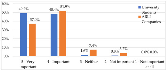 The second section of the questionnaire aimed to learn about the respondents’ attitudes towards and the perceived importance of adopting CE principles. The first question, Q2.1, revealed the importance of embracing CE to the companies and disciplines of the students (Figure 4). There is a clear trend: respondents consider embracing CE as (at least) an important asset to their spheres of operation. For companies, 51.9% selected ‘important’ and 37.0% selected ‘very important’, whilst for students, 97.6% (difference of +9%) considered CE as either important or very important to the future of their disciplines and careers. None of the participants thought that CE was not important at all.