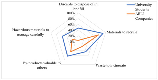 These results are highly consistent with findings in the literature. In this study, the options ‘Discards to dispose of in landfill’ (46.8% and 3.7%), ‘Materials to recycle’ (90.5% and 74.1%) and ‘Waste to incinerate’ (44.4% and 22.2%) were provided to the respondents. The difference between cohorts regarding the attitude towards landfills is remarkable. Similar responses within the literature received 6.3% for landfill, 77.6% for recycling and 4.1% for incineration [17], while respective response rates of 9.5%, 70.3% and 13.1% were recorded by Ferronato et al. [18]. This research included two additional options: ‘By-products valuable to others’ and ‘Hazardous materials to manage carefully’. The first option was used to expand the understanding of CE (in line with Industrial Symbiosis practices) and received a high number of responses (63.5% and 44.4%), where the waste generated by the industry is potentially an input for another industrial process. Only 22.2% of companies selected hazardous materials to manage carefully (e.g., medical waste) as a waste component.