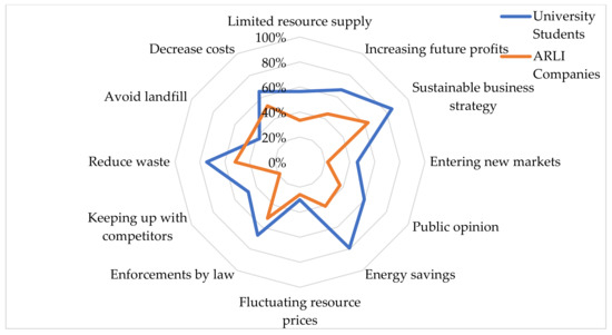 The results for the final question of this section, Q2.3, which asked about the main enablers of the successful transition to a CE, are shown in Figure 6. Herein it is observable that students once again have on average a higher opinion of the options provided (excepting ‘avoid landfill’). Students have selected the ‘Sustainable business strategy’, ‘Energy savings’ and ‘Reduce waste’ options as the most important (with 84.9%, 79.4% and 74.6% respectively), whilst ‘Avoid landfill’ and ‘Fluctuating resource prices’ were the least important (with 37.3% and 30.2%). On the other hand, ARLI companies’ responses aligned strongly with the ‘Sustainable business strategy’ being the first enabler to a CE (with 63.0%), whereas the choices with the lowest response rates were ‘Fluctuating resource prices’, ‘Entering new markets’ and ‘Keeping up with competitors’ (with 25.9%, 22.2% and 18.5% respectively).