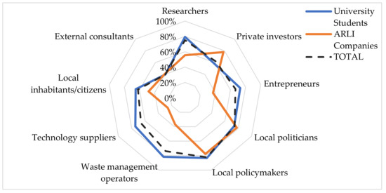 In this current research, the actors who received the higher number of total responses were Local politicians (with an average of 75.8%) and Local policymakers (80.6%). External consultants were considered least important (with only 40.2% of the total responses), followed by Technology suppliers (66.0%). The largest differences between cohorts’ viewpoints were for Technology suppliers (with 74.6% and 25.9% respectively for students and companies), followed by Waste management operators (with 81.7% and 37.0% respectively) then Entrepreneurs (73.0% and 37.0%).