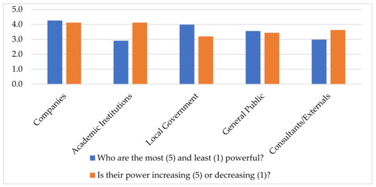 Figure 9 shows the results for the last question, Q3.3, on how respondents, in this case, the ARLI companies alone, perceive the power and power trends of stakeholder groups. The results will be compared and contrasted with the results from the Shapley value method [12] in Section 5. The most powerful stakeholders, i.e., those most able to bring about the transition to a CE, were deemed to be Companies (4.26) followed by Local Government (3.98), with Academic Institutions perceived to be the least influential of them all (2.91). As to the power of the perceived trend (with increasing power scored as 5 and decreasing scored as 1), Companies and Academic Institutions were both recognised as becoming more powerful (and therefore influential), the latter perhaps because of a renewed tendency, at least in the UK, to ‘follow the science’. On the other hand, the Local Government was considered to have decreasing power/influence in the CE transition whereas the perceived power of the General Public was considered to remain relatively unchanged. As stated by participant A-013: “the government has been struggling with budget cuts and the private sector and academy are filling those gaps”.