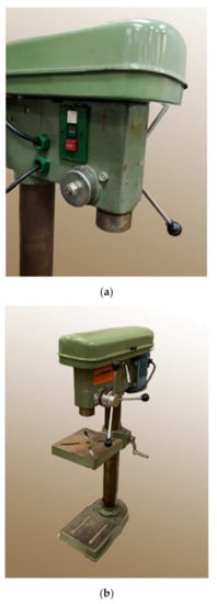 Drill press in its initial state. (a) Detail of the drill press in its initial state; (b) Full picture of the drill press in its state.