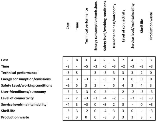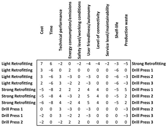 Figure 12 shows the matrix comparing the alternatives against the criteria. Concerning the characteristics, the values reported when positive refer to the alternatives in the left column; otherwise, if negative, they refer to the alternatives in the right column.