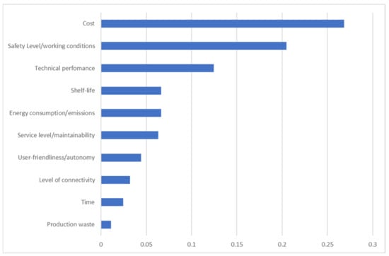 The analysis of the characteristics through the AHP showed that the most influential criteria were cost, service level/maintainability, and technical performance (Figure 13). It was found that the ideal solution was still the smart retrofitting solution (Figure 14) despite the higher purchase cost compared to the other solutions. This is because the smart retrofitting solution not only positively influences all parameters of digitization but also has a strong impact on the safety parameter.