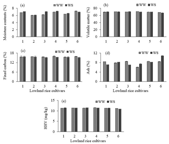 Proximate contents including moisture contents (a), volatile matter (b), fixed carbon contents (c) ash contents (d) and higher heating value (e) for six lowland rice cultivars in well−watered (WW) and water−stressed (WS) conditions. Vertical bars refer to ± standard errors for average data from three replicates.