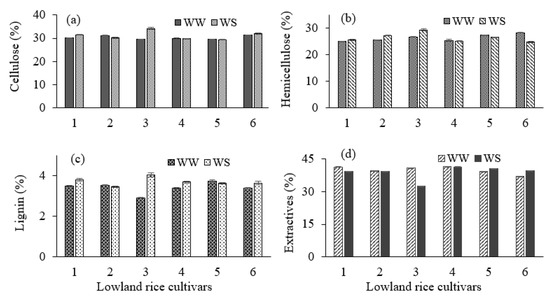 Cellulose (a), Hemicellulose (b), Lignin (c) and Extractives (d) percentages for six lowland rice cultivars in well−watered (WW) and water−stressed (WS) conditions. Vertical bars refer to ± standard errors for average data from three replicates.