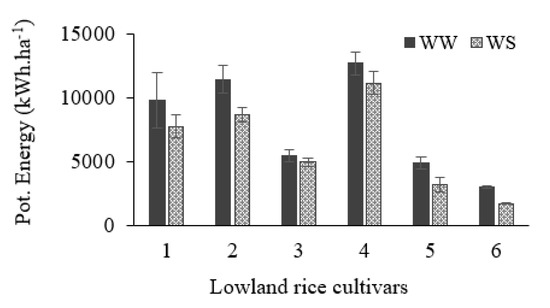 Potential bioenergy per hectare from biomass of lowland rice cultivars in well−watered (WW) and water−stressed (WS) conditions. Vertical bars refer to ± standard errors for average data from three replicates.