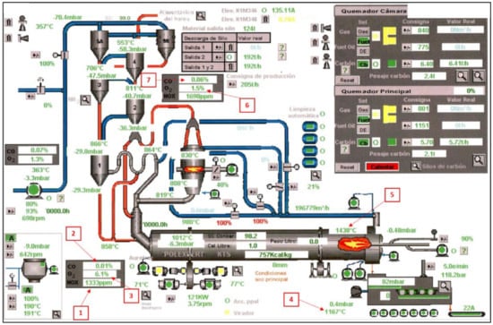 Hence, the parameters analyzed were the gases emitted by the kiln and the preheater (CO, O2, and NOx), and the SO2 in the chimney. Initially, only petroleum coke was used. Subsequently, a percentage of UTs (40%) and petroleum coke (60%), were used. [33]. Most of the alternative fuels were introduced into the preheater, where the consumption of UTs is around 80% of all the fuel that is introduced, compared to the 20% that is used in the kiln. This fact is due to the temperature requirements at each stage. The entire production process is regulated through a control center (Figure 1). The data obtained were stored with the quality parameters [34]. The kiln parameters illustrated in Figure 1 are the following: (1) O2 emissions; (2) CO emissions; (3) NOx emissions; (4) secondary air temperature; (5) sintering temperature; (6) analysis of O2 in the preheater; and (7) analysis of CO in the preheater.