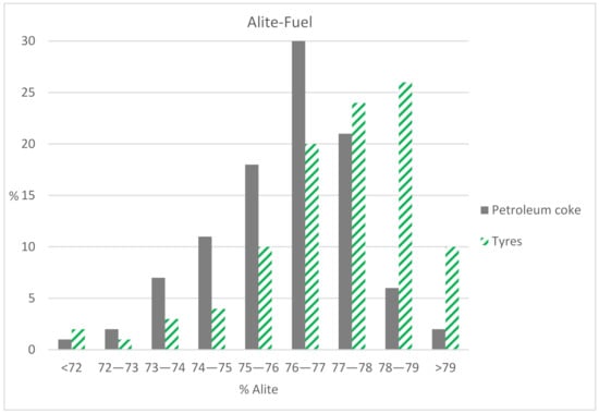 In this cement factory, values of more than 70% are considered optimal for the alite majority phase. All the results obtained from the factory exceed this value, regardless of the type of fuel. In Figure 2, an interval study of the C3S results is carried out depending on the type of fuel. It is observed that 87% of the values using petroleum coke are between 74% and 79% of C3S. For the same interval, the alite using alternative fuels reaches 84% of the values. Hence, it is noted that the quality values are adequate for both fuels.