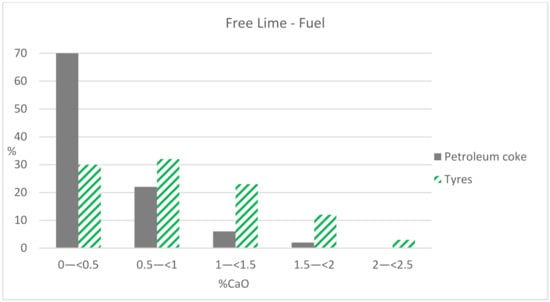 When using petroleum coke, 70% of the samples have values lower than 0.5% of the CaO phase, while the results of free lime are more distributed using tires as fuel, although always with values lower than 2.5% of CaO (Figure 3). Therefore, the higher the kiln sintering temperature, the lower the amount of free lime the clinker will have. The sintering temperature is higher when only petroleum coke is used as fuel, instead of using the mix (60% petroleum coke + 40% UTs).