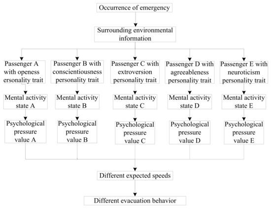 In behavioral psychology [27], psychology is the guidance of behavior, and behavior is the embodiment of psychology. Different psychological states produce different actions. Differences in people’s psychological conditions can be described by the “OCEAN” personality traits (“Big Five” personality traits) [26]. When an emergency occurs, passengers are affected by the external environment, and passengers with different personality traits have different psychological states and exhibit different evacuation behaviors. The emergency evacuation process considering the passengers’ personality traits is shown in Figure 1.