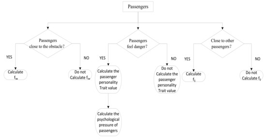 In an evacuation, passengers perceive other passengers, obstacles and emergencies and then calculate , and , representing the social interaction forces from other pedestrians, the forces from obstacles and the desired force of a pedestrian. Figure 2 shows the calculation flow of various points. As shown in Figure 3, when an emergency occurs, the psychological stress of passengers changes. This paper calculates the psychological stress of passengers based on their personality traits.