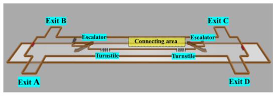 The subway station’s layout is shown in Figure 4. The length is about 160 m, and the width is about 50 m. The passengers were randomly distributed on the platform floor and the station hall floor. In emergencies, passengers evacuate to exits A, B, C and D using escalators and turnstiles.