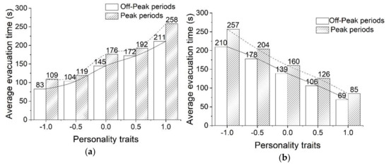 (a) Average evacuation time of the passengers with the personality traits; (b) average evacuation time of the passengers with the personality traits.