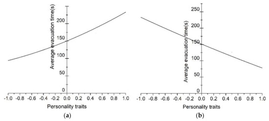 In this study, two groups of passengers with personality trait values of −1, −0.5, 0, 0.5 and 1 were selected to conduct simulation evacuation experiments. The evacuation time simulation results time are shown in Figure 5a,b. The average evacuation time increases with the value of agreeableness (and conscientiousness (. It decreases with the value of neuroticism (and extroversion (.