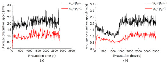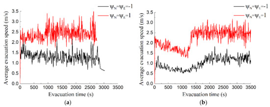 The speed variance of the passengers with was significantly different from that of the passengers with only during an evacuation in peak periods. The speed variance of the passengers with was 0.55, and that of the passengers with was 0.39. The average evacuation speed of the passengers with decreased significantly around 1200 s, forming a wave trough, as shown in Figure 8b.