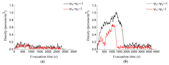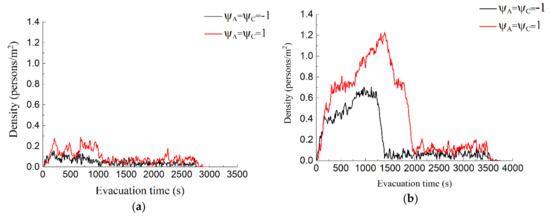 However, the density in the connecting area was significantly different during an evacuation in peak periods. The maximum density of the passengers with was 1.23 persons/m2, and that of the passengers with was 0.71 persons/m2. The reason for the phenomenon above is that passengers with are more cautious and docile than passengers with . When an emergency occurs, their psychological pressure value is relatively small, so their expected speed is little, resulting in a longer evacuation time after forming a bottleneck, as shown in Figure 9b. The maximum density of the passengers with was 1.04 persons/m2, and that of the passengers with was 0.69 persons/m2. The reason for the phenomenon above is that passengers with are more impulsive and anxious than passengers with . When an emergency occurs, psychological pressure of passengers with is relatively large, and their expected speed is also more considerable. After a bottleneck is formed, it dissipates quickly, and the density in the connecting area is relatively small, as shown in Figure 10b.