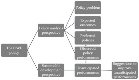 This paper is a qualitative policy analysis conducted using a policy analysis perspective and a sustainable development perspective, as shown in Figure 1. A qualitative policy analysis is beneficial for its ability to make seemingly unmanageable public policy become manageable [19]. It can be viewed as a process and also a product [20]. As a process, this paper applies a policy analysis perspective and a sustainable development perspective to examine materials from a wide range of government documents, think-tank statistics, and academic literature to study the OWE policy and identify policy dilemmas. As a product or an outcome, this paper presents policy suggestions to improve unanticipated performances resulting from the OWE policy.