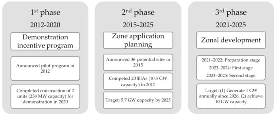 The OWE policy rollout is divided into three phases as detailed in Figure 2. The first phase, “demonstration incentive program”, viewed as a pilot incentive program, involves demonstration awards. Specifically, the BOE selected wind turbine manufacturers and operating companies, and subsidized construction of wind turbines and wind farms. The two demonstration units were scheduled to complete in 2020. The second phase, “zone application planning”, involves announcements and applications of potential sites. The BOE selected 36 potential sites, of which 24 remained after excluding the navigation channels of transportation vessels, for manufacturers and operating companies to choose from and apply for development. To acquire the exclusive development privilege, the vendors were required to complete the necessary environmental assessments by 2017. The construction of the wind turbines is expected to be completed by 2025 [56]. In the BOE’s “Draft of Application for Development and Site Planning of Offshore Wind Power Zones,” the third phase, “zonal development”, will open in the middle of 2021, with vendors evaluating the sites themselves and applying to develop the sites in accordance with relevant laws and regulations [57].