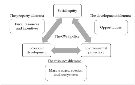 The concept of sustainable development has many contradicting facets by nature, which often cause dilemmas for policy makers while they are planning and implementing policies. The concept of sustainable development involves three components: environment, economy, and equality (the three Es). The three Es refer to maintaining environmental sustainability in order to support quality of life, maintain income and economic growth, and maintain human rights and equality to ensure social sustainability, respectively [26]. Implementing sustainable development policies necessitates striking a balance between the three Es. This is challenging. When one is promoted, the other two will fall into disequilibrium. Moreover, organizing the three Es into random pairwise combinations causes clashes between their goals and directions [27]. Campbell [28] referred to this as “the planner’s triangle,” i.e., the balance between social equity and economic development tends to spur conflict over property accumulation and distribution; the balance between economic development and environmental protection tends to incur conflicts over resource use; while the balance between environmental protection and social equity tends to incite disputes over development and developmental models. The planner’s triangle approach is a heuristic and aspirational approach for analyzing public policy against the idea of sustainable development [29]. Section 4 of this paper applies the planner’s triangle to identify Taiwan’s OWE policy dilemmas and presents recommendations to address policy dilemmas.