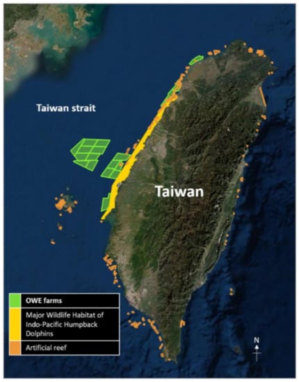 The OWE policy is administered by the BOE, an agency of the MOEA. The primary mission of the MOEA is to grow the economy, so OWE policy administrators, offshore wind energy operators, and users are likely to favor an anthropocentric viewpoint with regard to marine resource use. Taiwan’s western maritime region has excellent wind conditions; thus, several maritime sites in this region have been designated for wind farms. However, the designated maritime sites for wind farm construction and windmill ship operations overlap greatly with breeding grounds and they are also a major wildlife habitat for the Indo-Pacific humpback dolphin, as shown in Figure 4 [71]. In fact, the Indo-Pacific humpback dolphin is an endangered species [72]. The sightings of this dolphin in 2020 were less than 60 [73].