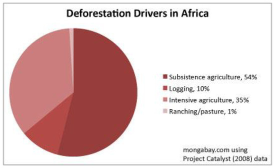 Agriculture is the main driver of deforestation in Africa. Deforestation in the Congo basin rainforest is caused by local subsistence activities by poor farmers and villagers who rely on forest lands for agriculture and fuelwood collection often using slash-and-burn/fallow techniques (Figure 1) [14]. There are approximately 10,000 species of tropical plants in the Congo Basin and a huge variety of animals, including big mammals like African forest elephants, forest buffalo, chimpanzees, bonobos, and a number of subspecies of gorilla. Some of these species have a significant role in shaping the character of their forest home. The South African forestry industry contributes 9.8% of the country’s gross domestic product (GDP) and it is a home to about 23,420 species of vascular plants and 1632 known species of amphibians, birds, mammals, and reptiles, of which 13.9% of these species are endemic. The natural beauty will all be greatly affected following the loss of forested areas [15].