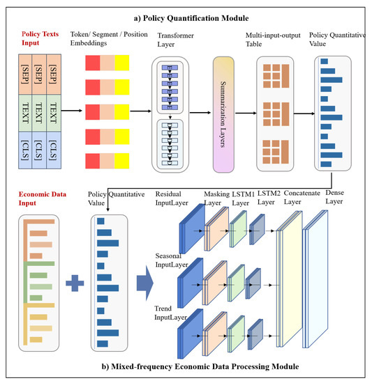 - Second, the output of the policy quantification module (PMC-Index) and mixed frequency economic data are integrated. This step is to implement the joint processing of structured data and unstructured data.