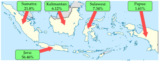 Indonesia is the fourth largest country in the world, with almost 268 million residents in 2018 [1]. This population is expected to grow at a rate of 1.1%, which is the same as the world’s population growth rate [2]. Although there are at least 17,000 islands in Indonesia, around 85% of the population are living on three islands: Java (56%), Sumatra (21%) and Sulawesi (7%), as shown in Figure 1 [3]. The development of infrastructure, which supports business growth, is focused mostly on Java, where the government and business capitals are based.