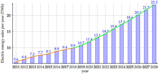 These industrial estates are expected to attract new workers from different parts of Indonesia, i.e., they demobilize the people from going to Java. Hence, apart from supplying the industrial estates, the electricity is also required to supply residents. In the last 7 years, the electric energy sales in Sulawesi increased at a rate of 9%, i.e., from 5.6 TWh in 2011 to 9.9 TWh in 2018 [10]. Based on this number, it is expected that the electrical energy sales will reach 23 TWh in 2028. The realization and estimation of the electrical energy sales in Sulawesi are shown in Figure 2.