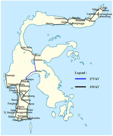 In Sulawesi, currently, there are two systems: Northern Sulawesi and Southern Sulawesi [10]. The existing transmission systems are presented in Figure 3, and consist of 150 and 275 kV lines. The Southern System is bigger than the Northern System; the peak loads are 1413 and 421 MW, and the current generation capacities are 1977 and 573 MW [17,18]. On the other hand, the electricity growth is also high, and the location of the green energy resources is far away. For this reason, the government planned to connect these two systems, allowing the transmission of green natural energy resources on this island. With the interconnection of the system, the system reliability will increase. In addition, the levelized cost of electricity (LCOE) will become cheaper due to the sharing of energy between the interconnected systems.