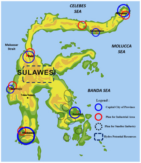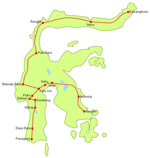 Sulawesi is expected to become the center for stainless steel-based industries [8]. At least three large smelters to purify nickel are currently being built (becoming part of the 14 industrial estates), i.e., Morowali, Konawe and Bantaeng. With these three estates, it is expected that Indonesia will be able to export more than 6 million tons of stainless steel per year [9]. Furthermore, Sulawesi also plays an important role as the hub between the eastern part of Indonesia and the rest of the world. Therefore, developing the infrastructure in Sulawesi is necessary in order to enhance the contribution of the eastern part of Indonesia to the national GDP [8,9].