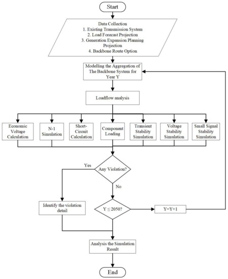 The transmission voltage level is the critical issue to be decided. At the time, there were two options to choose from, 275 and 500 kV. The selection of the voltage levels on the transmission line considers various criteria, including load growth factors, capital investment costs, land acquisition costs, power flow analysis, short circuiting, stability dynamics and reliability, as presented in Figure 5. Seven criteria were considered in the determination from the technical aspects, namely the economic voltage, voltage angle, contingency N-1, short circuiting, transient stability, voltage stability and small signal stability, which were evaluated in every time slice. Considering only the economic perspective, low-level voltage would be chosen as the solution due to the low investment cost. On the other hand, the high-level voltage has better technical requirements than the low-level voltage. In order to address these concerns, the procedure was simulated for these two voltage levels, starting from the low-level voltage. If the low-level voltage satisfied the technical and economic procedures, the simulation could be stopped.