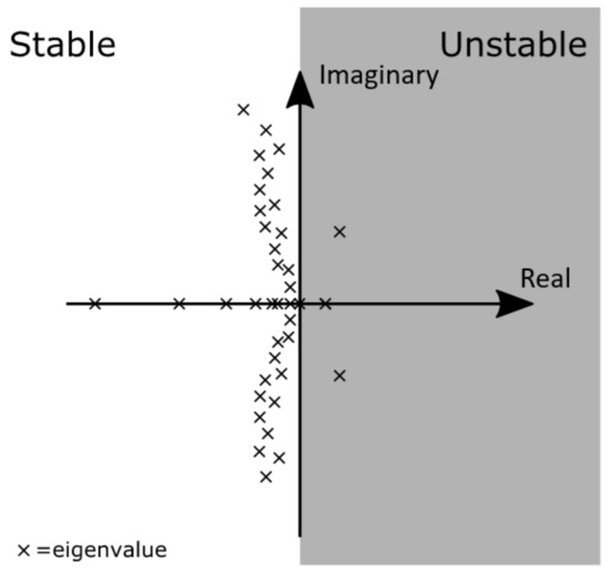 Small signal stability is the stability of the system when faced with minor disturbances such as sudden load changes. When load changes occur, the generator must be able to respond by changing the power produced. In response to load changes, the generator is usually equipped with equipment such as a Load Frequency Control (LFC), an Automatic Voltage Regulator (AVR) and a Power System Stabilizer (PSS). In the small signal stability analysis, the generator is modeled as a block diagram. Based on the block diagram, state equations can be formulated in a general form, as shown in Equation (2) [33,34]. The variable u in the equation is the input, which includes the excitation voltage, turbine power and torque input, while variable x is the state variable, which includes the rotor current and rotor flux [35]. The linearized dynamic model of the Sulawesi system was modeled using the Equation (2). The system is stable if the eigenvalue of matrix A is negative in its real component, as illustrated in Figure 8 [33].