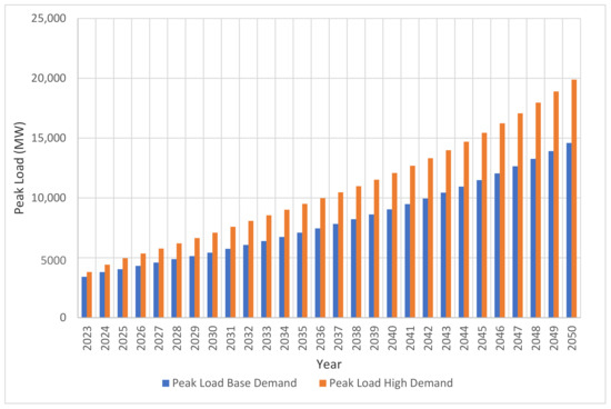The forecast results for the peak load of the SES are shown in Figure 9. The average peak load growths for the Sulawesi system were 5.53% and 6.33% annually for the base-demand scenario and the high-demand scenario, respectively. In the final year of the planning period of 2050, the peak load reached 14,597 MW for the base-demand scenario and 19,887 MW for the high-demand scenario.