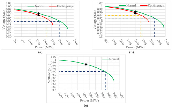 In 2034 and 2037, the load increased to 1603 and 1887 MW, respectively, while the Pcrit became 2355 and 2803 MW. The increase in Pcrit was not caused by the increase in the load, but due to the addition of generators enabling the system to become more robust. The increase in Pcrit was smaller than the load growth, such that the margin between the load and Pcrit was smaller, although it still met the standard. However, when there was a contingency in the line of Daya Baru–Sidrap 2, Pcrit decreased to 1944 MW in 2034, while in 2037 the voltage stability standard was violated, such that the curve could not be plotted (Figure 11c).