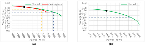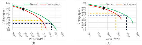 For the 500 kV backbone for both scenarios, all of the voltage stabilities remained at safe limits; this is due to the fact that at higher voltage levels, the system is more stable. When the load is the same, but the voltage is higher, the current will be smaller, so the voltage drop is smaller. The smaller the voltage drop, the greater the Pcrit value. For comparison, Figure 13 shows the PV curve at the same time that 275 kV was violated. In the base-demand scenario in 2037, the load at 500 kV was equal to 275 kV, which is 1887 MW, but the Pcrit value was greater at 4671 and 3762 MW for the normal and contingency scenarios, respectively. Likewise, for the high-demand scenario in 2034, the load was the same, which was 1801 MW, but the Pcrit values were greater, which were 3309 and 2695 MW for the normal and contingency scenarios, respectively.