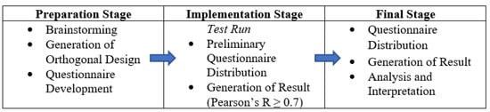 The attributes and design of this research underwent conceptualization as presented in Figure 2. This study considered the different attributes in the preparation stage from which different studies were considered to formulate the attributes and levels. Due to the COVID-19 pandemic, this study focused on attributes present in the Philippines where this was conducted. The implementation stage ran a preliminary test to determine the validity of the conjoint analysis orthogonal design. According to Hair [57], a Pearson’s R-value greater than or equal to 0.70 indicates that the orthogonal design may be considered acceptable [30,31,46]. This study had an initial result of 0.912—considered to be a high relationship among the responses and attribute of preference. The final stage involved the questionnaire distribution, generation of results, and analysis and interpretation.