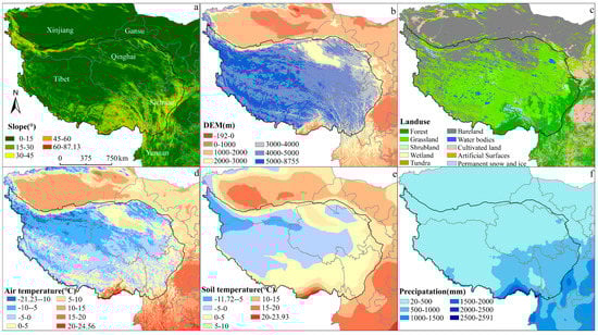 The QTP is the youngest, highest and largest plateau in the world with an average height of over 4000 m and an area of approximately 2.57 × 106 km2. It stretches from the Pamirs to the Hengduan Mountains and from south of the Himalayas to north of the Kunlun-Qilian Mountains [26]. In this study, the study area included not only the main body of the Tibet Plateau, but also the surrounding areas bordering on the Tibet Plateau, namely western Xinjiang, central and southern Gansu, central Sichuan and northern and central Yunnan (Figure 1a). The study area ranges in slope from 0 to 54° (Figure 1a). The land cover of the study area mainly consists of grassland, bare land, forest, cultivated land and permanent snow and ice (Figure 1c). The distribution of permafrost in the QTP is shown in Figure S1, and the areas of permafrost and seasonally frozen regions are 1.06 × 106 km2 and 1.46 × 106 km2, respectively [27].