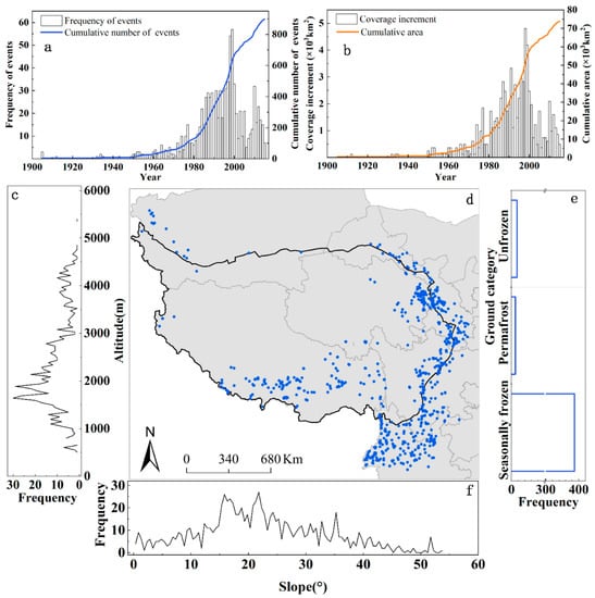 Slope geohazard distributions in the study area, 1905-2015. (a) Slope geohazard frequency per year and cumulative frequency (blue curve); (b) covered area of the slope geohazards per year and cumulative covered area (orange curve); (c) frequency of slope geohazards at different altitudes; (d) spatial distribution of slope geohazards in the study area; (e) frequency of slope geohazards in permafrost regions; (f) frequency of slope geohazards at different slopes.