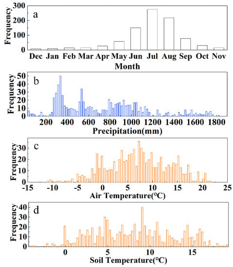 The temporal and meteorological characteristics of slope geohazard distributions in the study area. (a) Monthly frequency of slope geohazards; (b) annual precipitation at slope geohazard sites; (c) average annual air temperature at slope geohazard sites; (d) average annual soil temperature at slope geohazard sites.