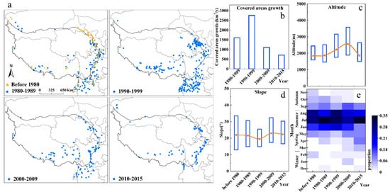 Slope geohazard change in different periods. (a) Spatial distribution of slope geohazards in different periods (the orange triangles represent geohazard sites before 1980, and the blue circles represent geohazard sites from 1980–1989, 1990–1999, 2000–2009, and 2010-2015); (b) the growth rate of the covered area; (c) the altitude of slope geohazards in different periods (the blue box represents 25%–75% of altitude range in geohazard sites, and the orange curve represents the variation in average altitude); (d) the slope gradient of slope geohazards in different periods (the blue box represents 25%–75% of slope range in geohazard sites, and the orange curve represents the variation in average slope); (e) the monthly proportion of slope geohazards in different periods.