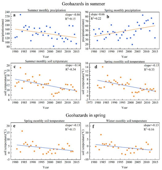 The increasing frequency of slope geohazards is not only related to precipitation, but also affected by soil temperature. Considering the lagging influence of climate on geohazards, the precipitation and temperature of the previous season should also be taken into account in addition to the precipitation and temperature of the season in which the geohazards occur. The summer monthly precipitation corresponding to the summer geohazards decreased (Figure 5a), while the spring monthly precipitation increased (Figure 5b). The summer and spring soil monthly temperature corresponding to the summer geohazards both decreased (Figure 5c,d). This result suggested that summer geohazards are affected by summer precipitation, spring precipitation, summer soil temperature and spring soil temperature and tend to develop in regions with lower soil temperature in spring, lower soil temperature and less precipitation in summer and that the increase in spring precipitation may lead to geohazards in some areas during summer. The spring and winter soil monthly temperatures corresponding to spring geohazards decreased at a rate of 1.3 °C/10a (Figure 5e,f). This result suggested that spring geohazards are affected by winter and spring soil temperatures and tend to develop in regions with lower soil temperatures in winter and spring. There was no obvious influence on spring geohazards with spring, winter precipitation and air temperature (Figure S5a,b,e,f) and no obvious influence on summer geohazards with spring or summer air temperature (Figure S5c,d).