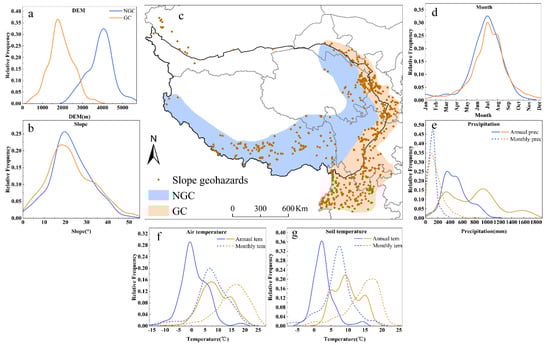 Comparison of the characteristics of new slope geohazard clusters (NGCs) and previously reported geohazard clusters (GCs). (a) Elevation-geohazard frequency curve comparison (blue curve refers to NGC, orange curve refers to GC); (b) slope-geohazard frequency curve comparison; (c) the comparison of the two clusters spatial distributions; (d) month-geohazard frequency curve comparison; (e) precipitation-geohazard frequency curve comparison (the solid line refers to the annual precipitation of geohazards, while the dotted line refers to the monthly precipitation of geohazards); (f) air temperature-geohazard frequency curve comparison (the solid line refers to the annual temperature of geohazards, while the dotted line refers to the monthly temperature of geohazards); (g) soil temperature-geohazard frequency curve comparison.