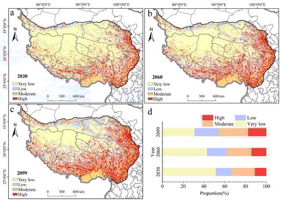 The slope geohazard sensitivity map area proportion of different grades. (a) Slope geohazard sensitivity map in 2030; (b) slope geohazard sensitivity map in 2060; (c) slope geohazard sensitivity map in 2099; (d) area variation across the sensitivity grades in different periods.