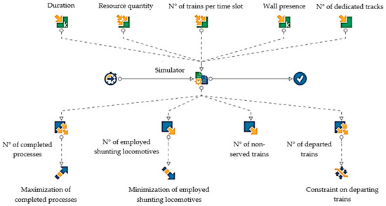 The labelling of the elements displayed in the BPMN models, and concerning specifically railway operations, has been based on a schematization of the port railway network which refers to the current layout of the railway infrastructure of the commercial port. This representation has also served the parametrization phase of the models, suggesting clear reference to the various parts of the analyzed transport node. The schematization considers the following main components of the port network: the main station connecting the port network to the national one, different sets of tracks used to carry out shunting operations, the two gateways separating the Free Port zone from the external areas, and the three terminals present in that area of the Port of Trieste. In addition, some side but yet fundamental infrastructural resources have been taken into account and consist of the switches connecting with each other the abovementioned components, which allow the occurrence of train traffic. The developed overview of the port railway network has enabled also the identification of the itineraries that can be travelled by trains and, in particular, the necessary shunting operations to enter/exit them in/from the port. This task has highlighted the existence of conflicting points due to the availability of some limited infrastructural resources (i.e., single tracks), anticipating the presence of potential bottlenecks, that has been effectively proved by simulation runs at a later time. The parametrization phase has consisted in the setting of the characteristics of the simulation model elements, namely in relation to the duration of the simulation scenario (including a proper warm-up time), the generation and distribution of tokens, the quantity of operational and infrastructural resources, the duration of tasks, and the principles regulating process flows at decision points. For simulation purposes, some operational requirements have been determined for the management of resource, i.e., the occupancy of tracks and the use of shunting locomotives, in order to reflect the actual system operations. Furthermore, train arrivals and departures have been determined according to the potential residual capacity of the national railway network in different time slots, with reference to an average-traffic day. With respect to the capacity of the considered port area, exceeding trains have been overlooked and accounted for the estimation of possible traffic volumes in other parts of the Port of Trieste. Regarding queue management, the logic for ordering trains assumed in the simulation model considers that, just as in reality, priority is given to trains that respect the scheduled timetable. Therefore, in case of queues, these latter are prioritized over the others in the deployment of resources. Figure 4 illustrates the workflow developed by means of mF to perform the multi-objective optimization procedure: it can be noticed that input variables are reported at the top through green icons, output variables are displayed by the blue icons at the bottom and, finally, the integration node with the external simulator is reported in the middle.