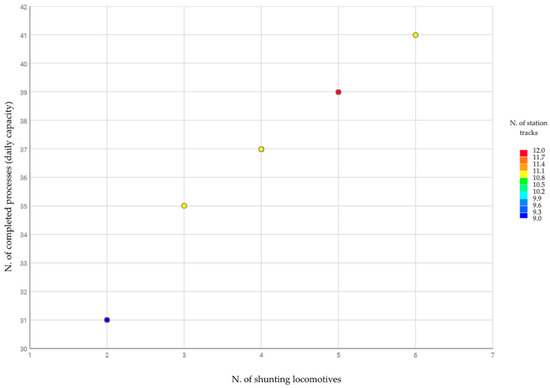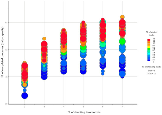 The outcome regarding the effect of the number of locomotives on capacity is confirmed in Figure 7, which shows such dependence even in relation to an internal collection of tracks used for shunting operations. The entity of tracks availability in this latter is captured by the diverse dimension of the diameter size of the bubbles, while, similarly to Figure 3, the same parameter referred to the main port station is indicated through the various colors by which bubbles are filled in. The minor relevance covered by the analyzed collection of tracks is tested by the presence of bubbles with a quite small diameter also in correspondence to high values of railway capacity, and the fact that many of them are colored red again emphasizes the greater importance of tracks availability at the main port station.