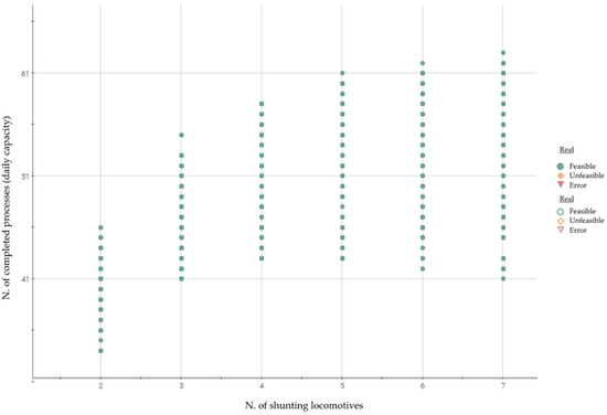 The results obtained by the multi-objective optimization procedure, discussed above, and indicating quite a linear relationship between the capacity increase and the number of shunting locomotives, gave insights for deeper investigations not only on the mutual influence of these two, but also on the potential contribution of further infrastructural components of the port railway network. To this end, a two-layer optimization procedure has been developed considering, on one hand, changes in the entity of employed locomotives and, on the other hand, in the amount of infrastructural resources of a certain shunting track collection. As illustrated in Figure 6, such articulation in computing the optimal capacity revealed that a significant rise of train flows is attainable until the number of used locomotives equals to five, which can be therefore assumed as a threshold value for the level of influence of those operational resources. As proof of this, it can be observed that a larger amount of shunting locomotives entails a decreasing marginal growth of railway traffic volumes.