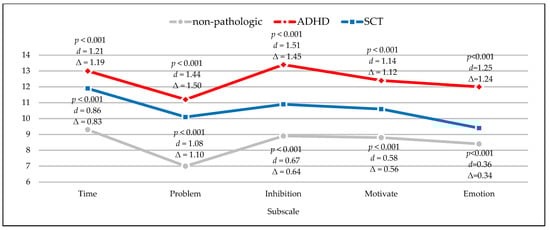 With the specific objective of comparing the executive functioning response patterns in the normative and clinical populations (Table A1) (Appendix A), firstly, Robust ANOVA was employed. This revealed statistically significant differences in the subscales of Time Self-Management (F = 113.82; p < 0.001), Self-Organization and Problem Solving (F = 98.09; p < 0.001), Self-Restraint and Inhibition (F = 149.66; p < 0.001), Self-Motivation (F = 93.83; p < 0.001) and Emotional Self-Regulation (F = 82.67; p < 0.001), as well as in the total scale (F = 218.11; p < 0.001). Next, the Bonferroni Post Hoc test revealed that the non-pathologic group showed significantly lower scores in comparison to the clinical groups, both for each subscale as well as for the total scale (Figure 1 and Figure 2). The effect size (d) of the differences was moderate (d > 0.50) or large (d > 0.80) in all cases, except the Emotional Self-Regulation subscale between the group of undiagnosed subjects and the subjects diagnosed with SCT, which was small (d = 0.36) The delta indicator (Δ) of the effect size was similar in all cases (Δ = 0.56–1.50), except for the Emotional Self-Regulation subscale, between the group of undiagnosed subjects and the subjects diagnosed with SCT (Δ = 0.34).